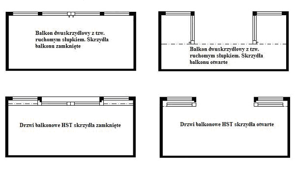 Poniższy rysunek mówi właściwie wszystko o zaletach drzwi HST w kształtowaniu powierzchni użytkowej i mieszkalnej. Będące alternatywą dla drzwi przesuwnych, klasyczne drzwi balkonowe po otwarciu skrzydeł wchodzą bardzo głęboko w przestrzeń mieszkalną, determinując możliwe rozwiązania związane z zagospodarowaniem wnętrz pomieszczeń. Mimo większej głębokości zabudowy od klasycznych drzwi balkonowych, to właśnie drzwi HST pozostawiają więcej swobody w dysponowaniu powierzchnią.
