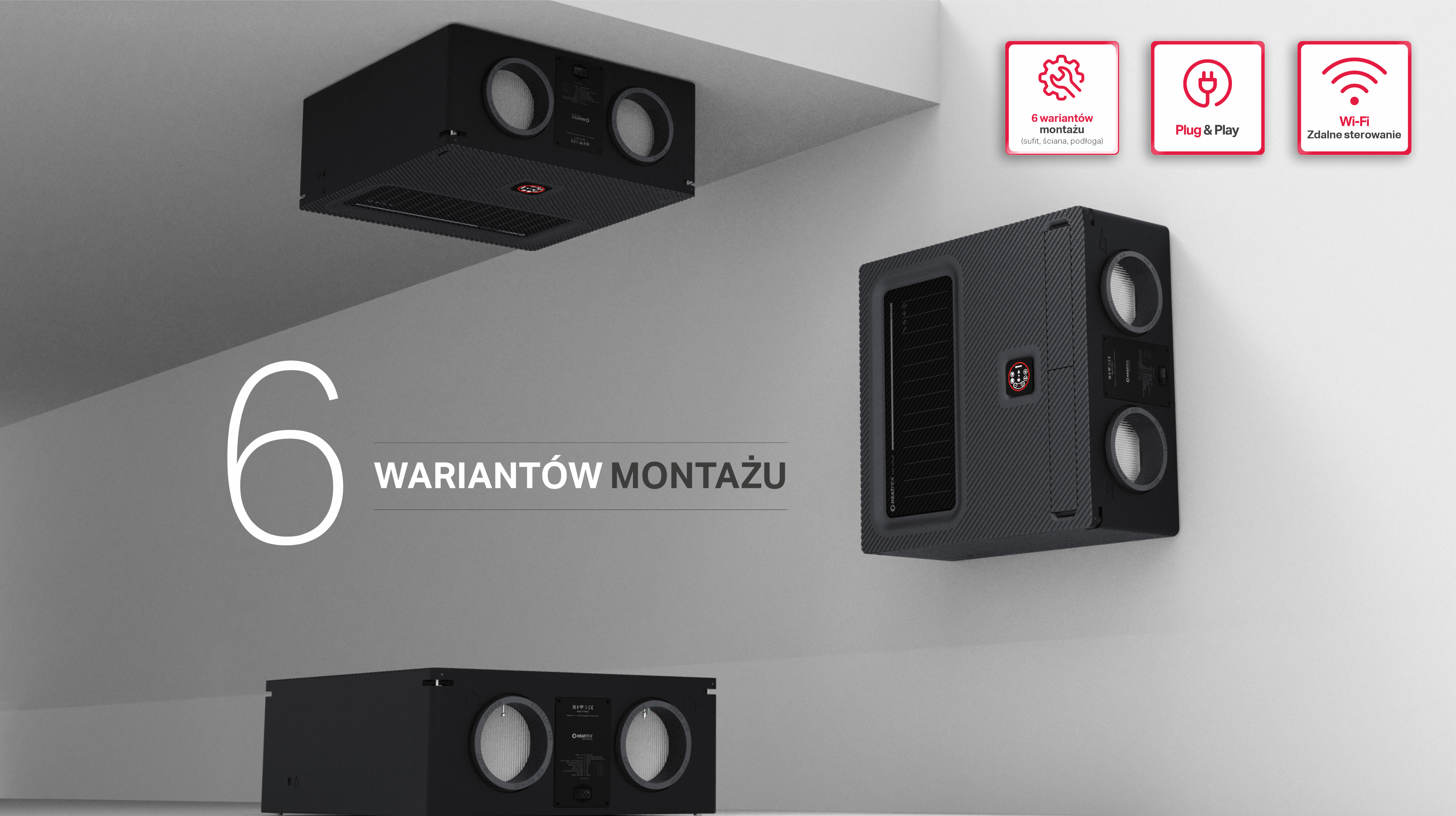 Rekuperator jako jedyny na rynku można zamontować w 6 pozycjach bez wpływu na efektywność jego pracy. Dzięki temu montaż i serwis jest niezwykle prosty. Całość domyka intuicyjny i prosty panel sterowania, który nie wymaga specjalistycznej wiedzy technicznej.
