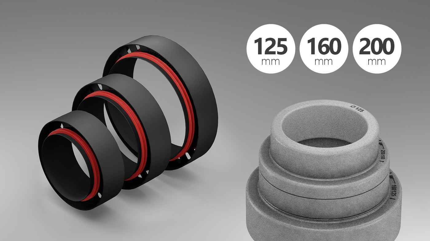 Systemowa redukcja 125/160/200 mm umożliwia dopasowanie systemu do każdej ze średnic.