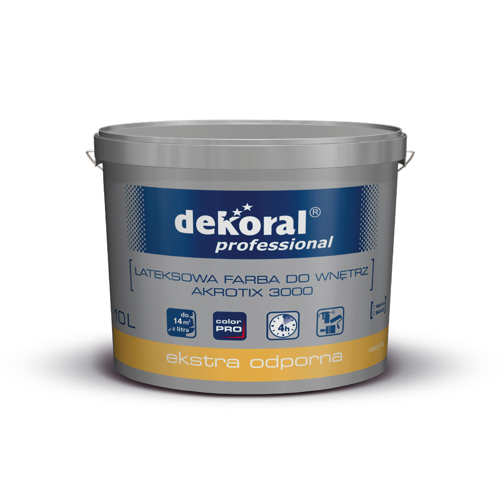Farba lateksowa AKROTIX 3000 satynowy przeznaczona jest do dekoracyjnego malowania ścian i sufitów wewnątrz pomieszczeń, wykonanych z tynków cementowo-wapiennych, tynków gipsowych, betonu, płyt gipsowo-kartonowych, flizeliny, tapet papierowych i z włókna szklanego, tynków strukturalnych i powierzchni wcześniej malowanych farbami lateksowymi lub akrylowymi.