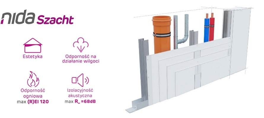 System NIDA Szacht umożliwia ukrycie szachtów instalacyjnych w budynkach oraz estetyczne wykończenie zabudowy. Dlatego jest coraz częściej wybieranym rozwiązaniem wśród wykonawców.